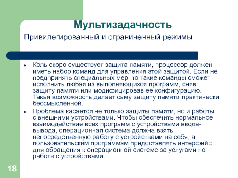 Проблема касается не только защиты памяти, но и работы с внешними устройствами. Чтобы обеспечить нормальное взаимодействие всех программ с устройствами ввода-вывода, операционная система должна взять непосредственную работу с устройствами на себя, а пользовательским программам предоставлять интерфейс для обращения к операционной системе за услугами по работе с устройствами.