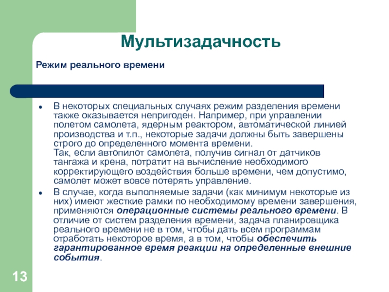 при воспроизведении видеопотока можно в случае крайней необходимости попросту пропустить некоторые кадры, в то время как те кадры, которые показываются на экране, должны быть распакованы и обсчитаны к строго определенным моментам времени. В подобных случаях говорят о мягкой системе реального времени, в противоположность жесткой (автопилот самолета)