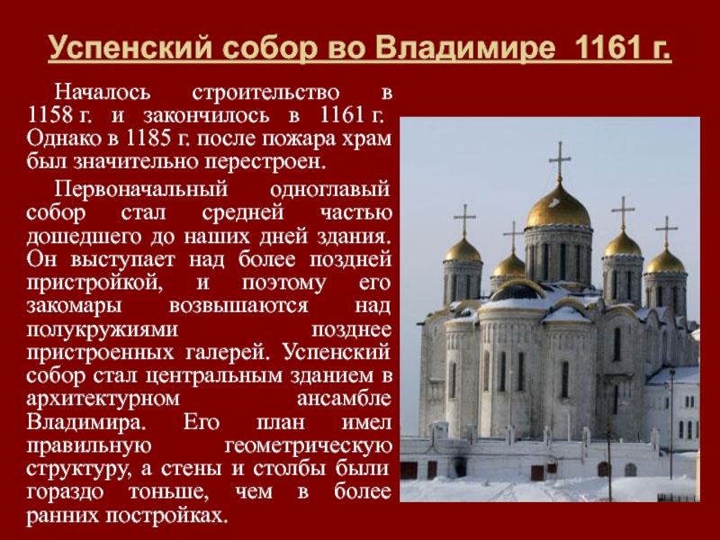Первоначальный одноглавый собор стал средней частью дошедшего до наших дней здания. Он выступает над более поздней пристройкой, и поэтому его закомары возвышаются над полукружиями позднее пристроенных галерей. Успенский собор стал центральным зданием в архитектурном ансамбле Владимира. Его план имел правильную геометрическую структуру, а стены и столбы были гораздо тоньше, чем в более ранних постройках.