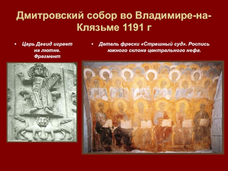 Дмитриевский собор являлся придворным храмом и был построен на княжеском дворе Всеволода III. Его стены содержат свыше 600 рельефов. Сюжеты рельефов содержат сказочные образы, близкие языческим представлениям недавнего прошлого. Большая часть изображений дошли до нас в первоначальном виде. Внутри сохранилась часть фресок 12-го века, например, композиция "Страшный суд".