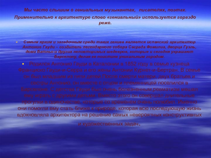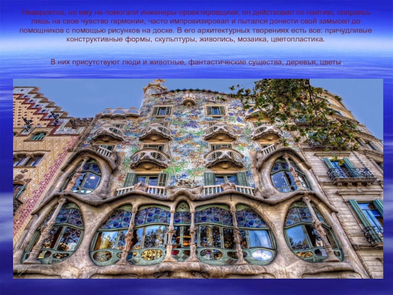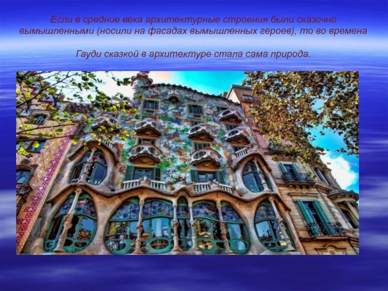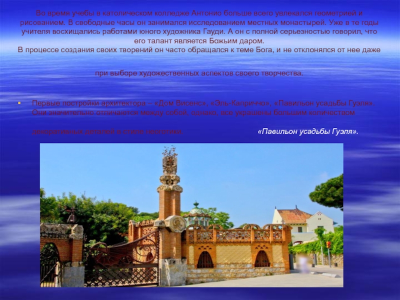 Первые постройки архитектора – «Дом Висенс», «Эль-Каприччо», «Павильон усадьбы Гуэля». Они значительно отличаются между собой, однако, все украшены большим количеством декоративных деталей в стиле неоготики. «Павильон усадьбы Гуэля».