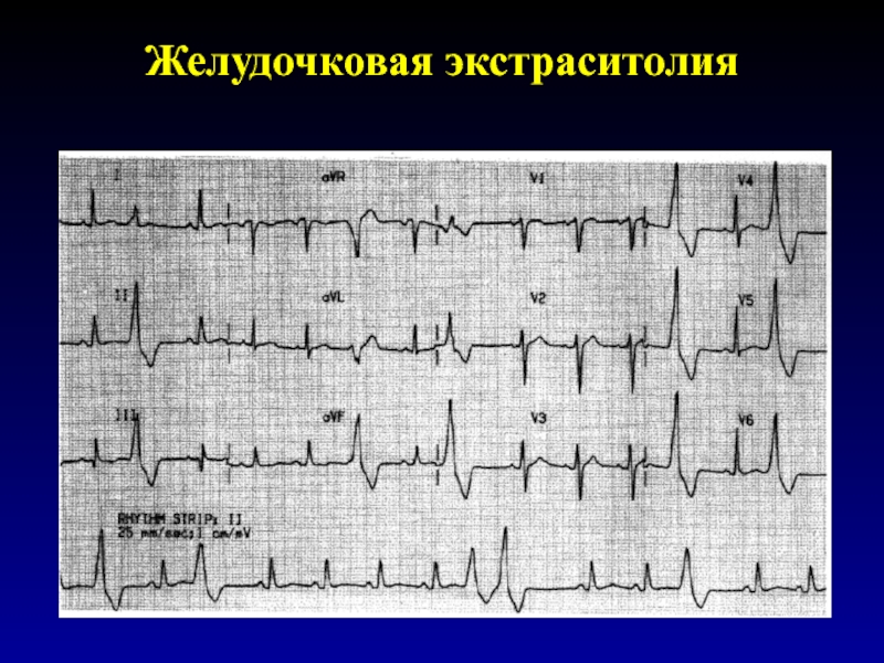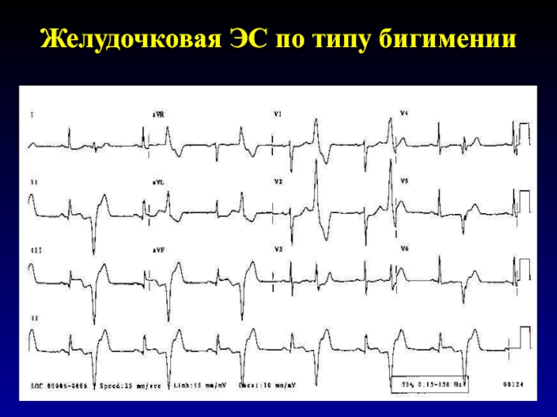 Желудочковые ЭС - досрочно QRS, нет Р, резкое уширение и деформация QRS, ST и Т дискордантны к QRS, полная компенсаторная пауза, локализация по блокаде противоположной ножки п.Гиса