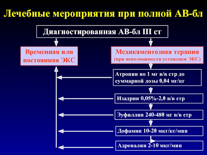 Слайд 42Лечебные мероприятия при полной АВ-бл