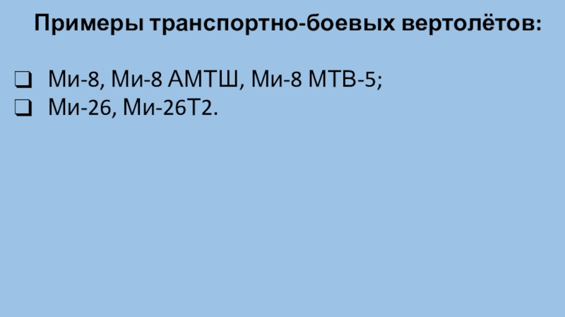 Примеры транспортно-боевых вертолётов:Ми-8, Ми-8 АМТШ, Ми-8 МТВ-5;Ми-26, Ми-26Т2.