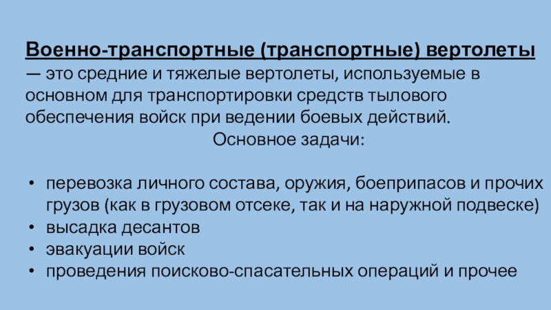 Слайд 21Военно-транспортные (транспортные) вертолеты — это средние и тяжелые вертолеты, используемые