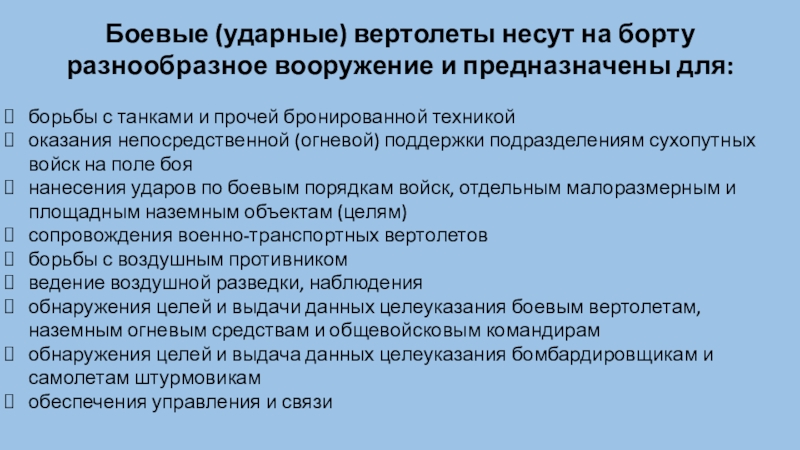 Слайд 8Боевые (ударные) вертолеты несут на борту разнообразное вооружение и предназначены