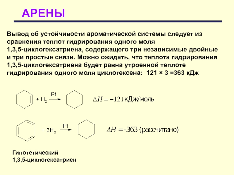 Вывод об устойчивости ароматической системы следует из сравнения теплот гидрирования