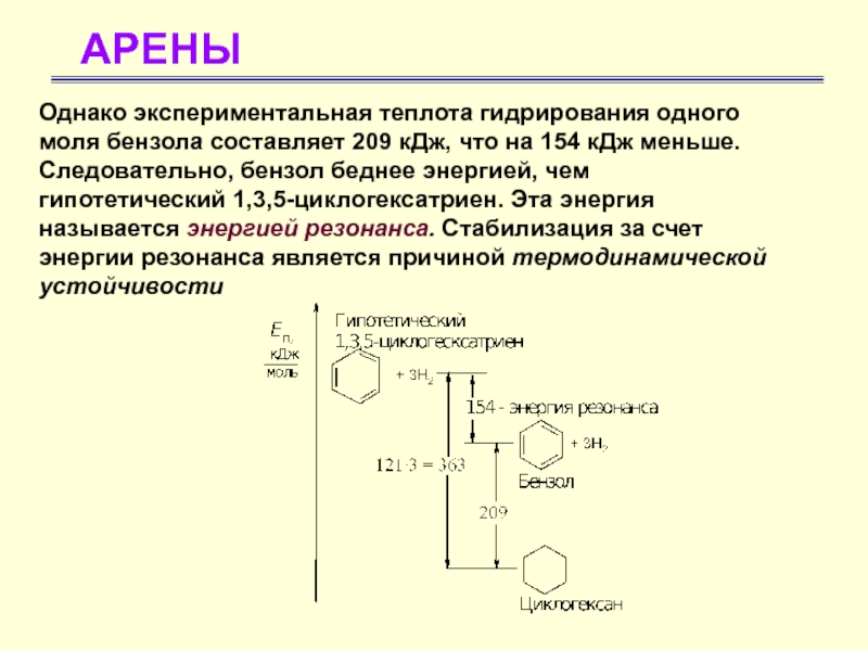 гипотетический 1,3,5-циклогексатриен. Эта энергия называется энергией резонанса. Стабилизация за счет энергии резонанса является причиной термодинамической устойчивости