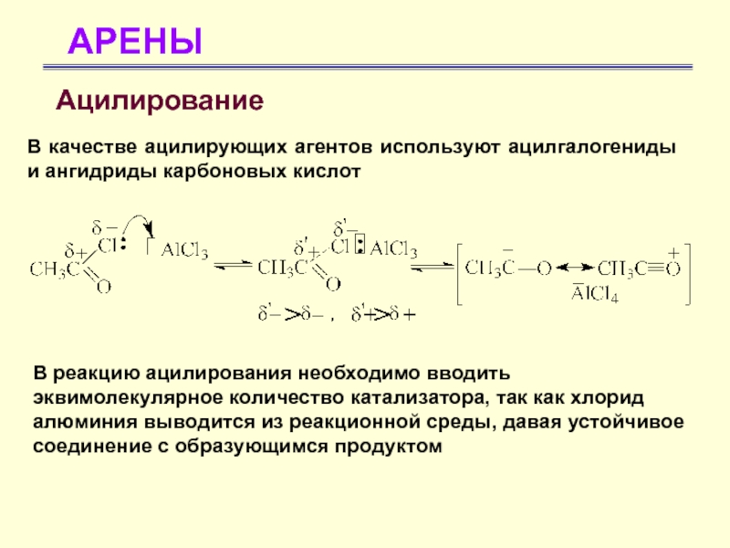 В реакцию ацилирования необходимо вводить эквимолекулярное количество катализатора, так как