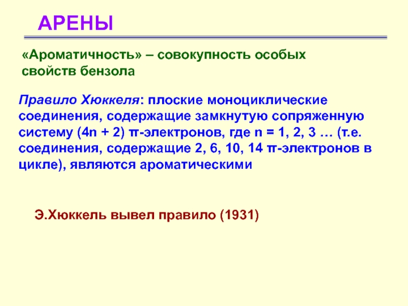 2) π-электронов, где n = 1, 2, 3 … (т.е. соединения, содержащие 2, 6, 10, 14 π-электронов в цикле), являются ароматическими