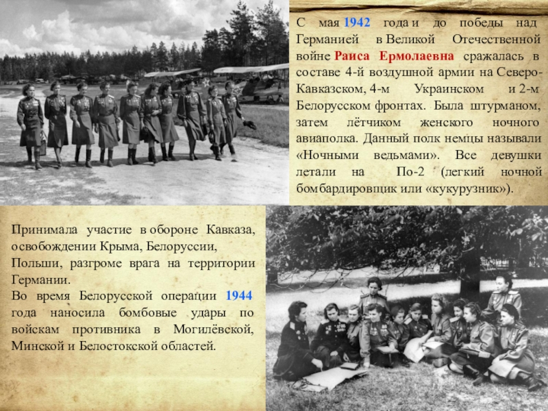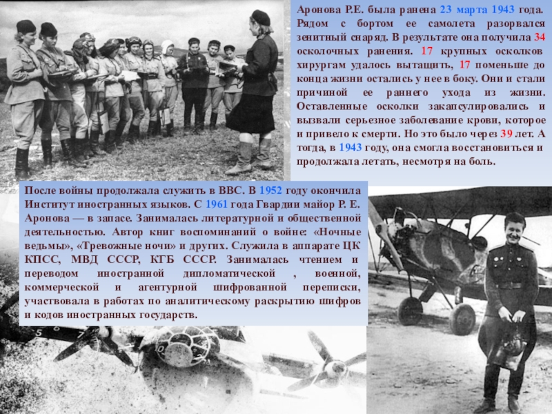 34 осколочных ранения. 17 крупных осколков хирургам удалось вытащить, 17 поменьше до конца жизни остались у нее в боку. Они и стали причиной ее раннего ухода из жизни. Оставленные осколки закапсулировались и вызвали серьезное заболевание крови, которое и привело к смерти. Но это было через 39 лет. А тогда, в 1943 году, она смогла восстановиться и продолжала летать, несмотря на боль.