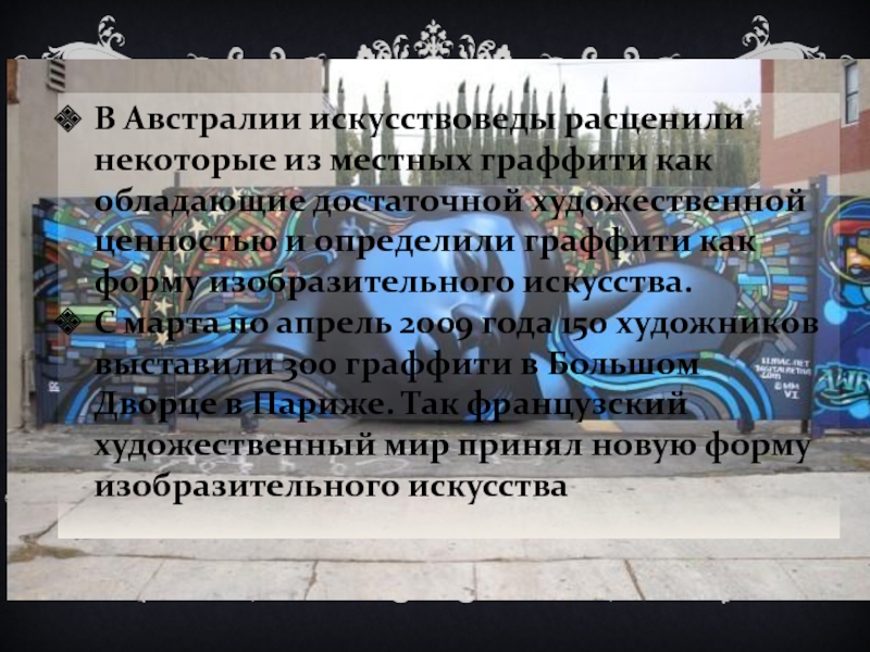 Слайд 40В Австралии искусствоведы расценили некоторые из местных граффити как обладающие