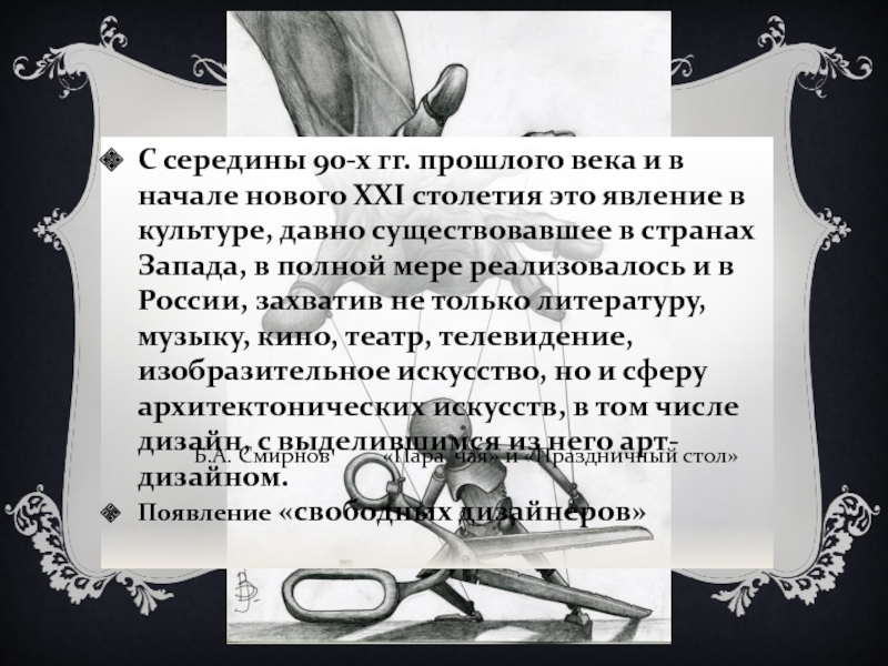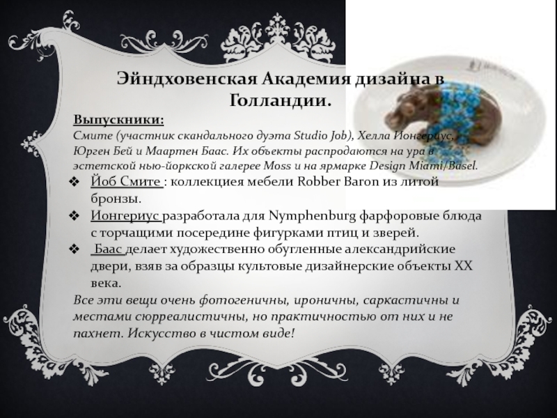 В чистом виде современное западное декоративное искусство – это проектирование через индивидуального потребителя, обладающего возможностями и необходимостью выразить свою принадлежность к «элите» через владение уникальностью .»