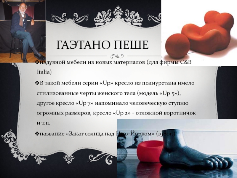 женского тела (модель «Up 5»), другое кресло «Up 7» напоминало человеческую ступню огромных размеров, кресло «Up 2» - отложной воротничок и т.п.