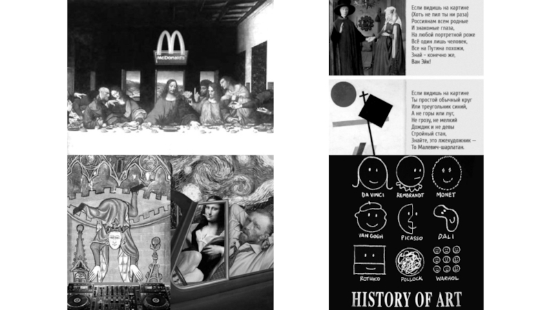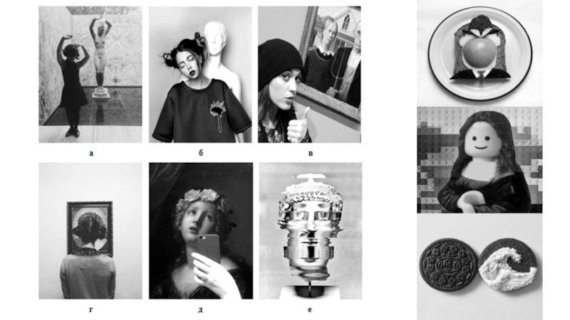 по характеру модификации произведения (совмещение нескольких произведений, замена героев, добавление современных предметов, переодевание, перемещение героев в современную среду, исчезновение героев, замена лица персонажа картины эмодзи, фото-фильтров, изменение названия, надпись-комментарий, высказывание героя, диалог героев, добавление цитаты, «арт-ликбез»);