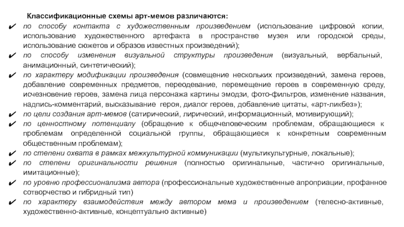 Слайд 20Классификационные схемы арт-мемов различаются: