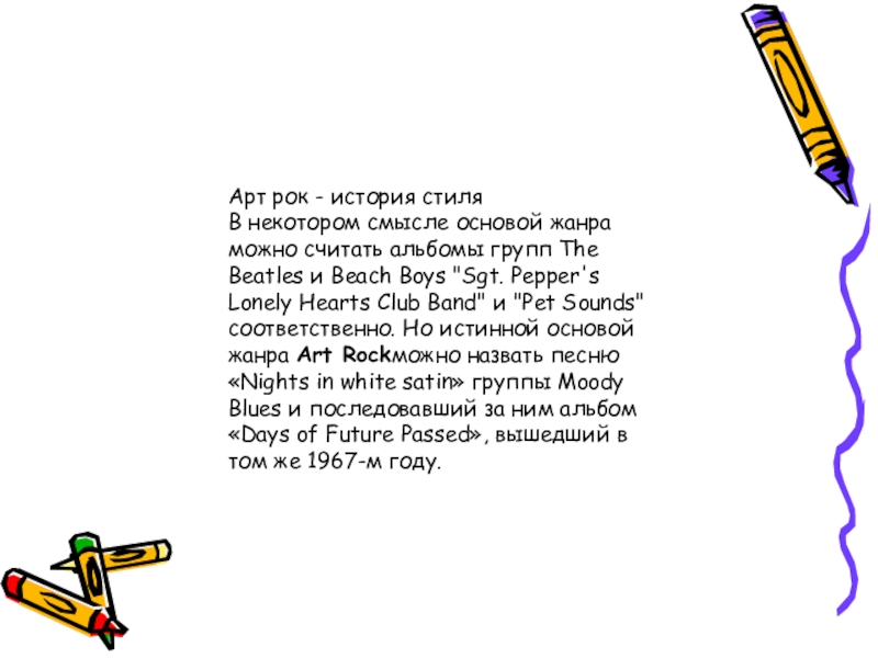Lonely Hearts Club Band" и "Pet Sounds" соответственно. Но истинной основой жанра Art Rockможно назвать песню «Nights in white satin» группы Moody Blues и последовавший за ним альбом «Days of Future Passed», вышедший в том же 1967-м году.