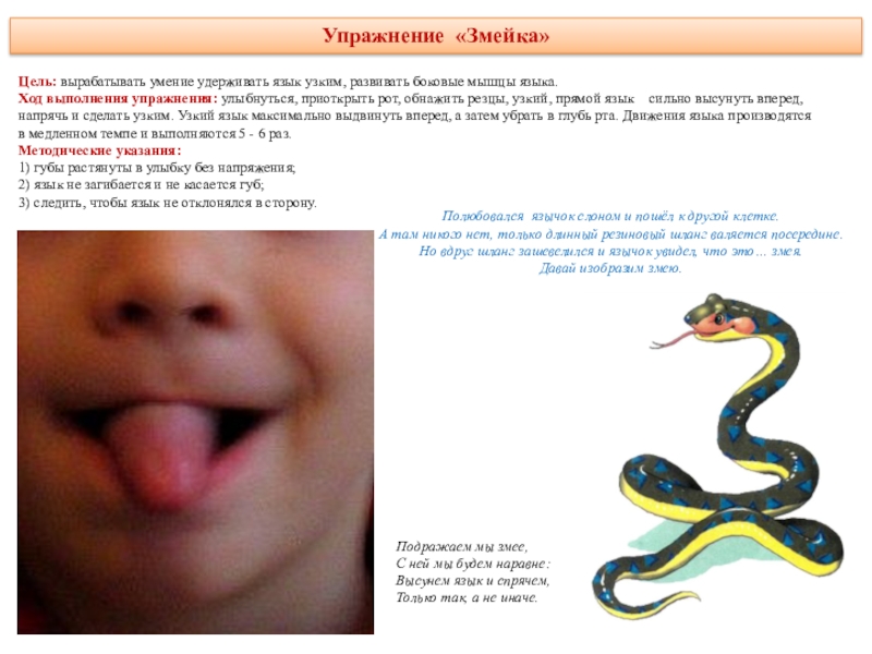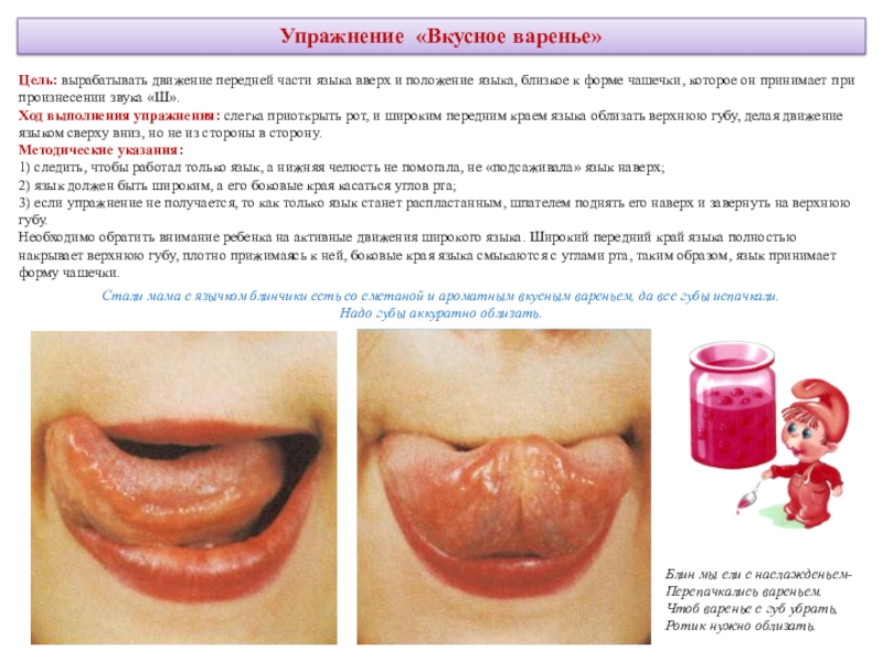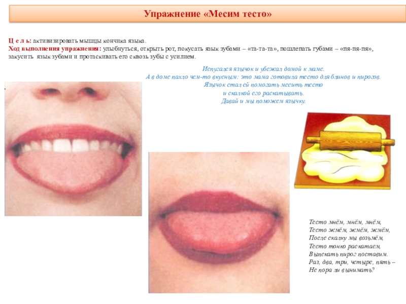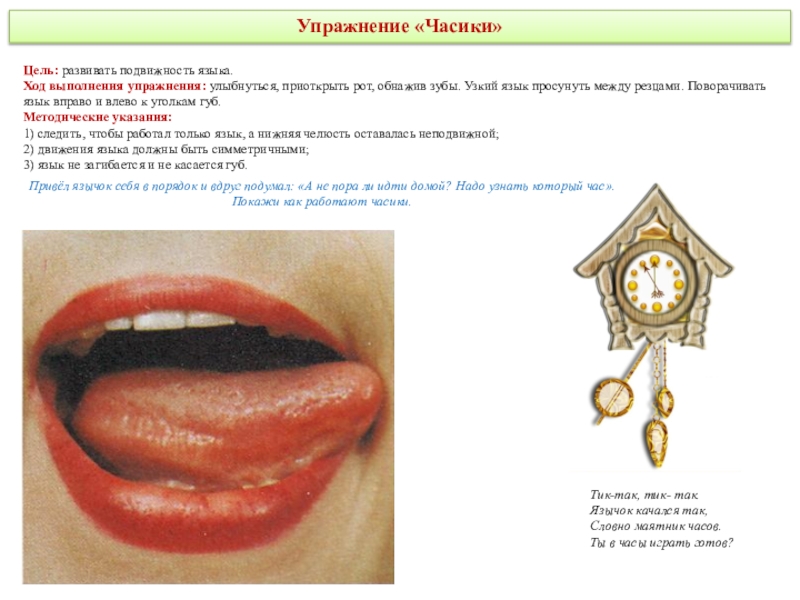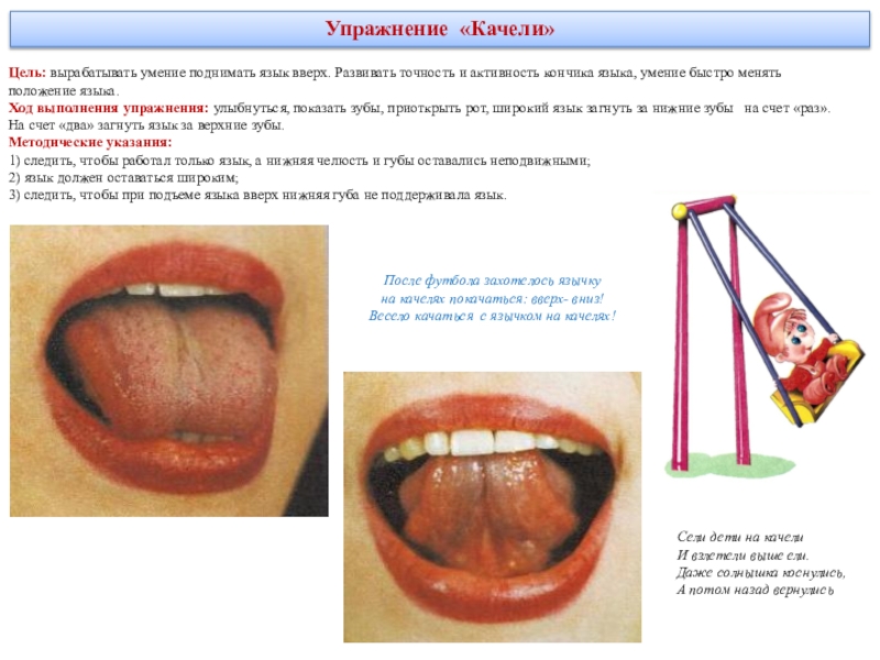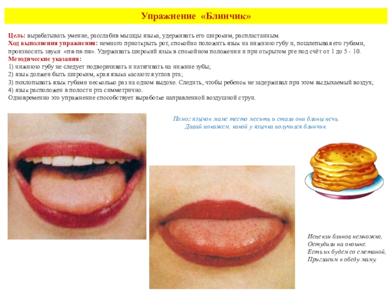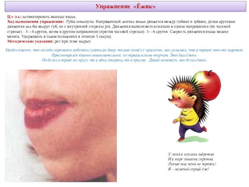 делая круговые движения как бы вокруг губ, но с внутренней стороны рта. Движения выполняются сначала в одном направлении (по часовой стрелке) - 5—6 кругов, затем в другом направлении (против часовой стрелки) 5—6 кругов. Скорость движения языка можно менять. Удерживать в таком положении в течение 5 секунд.Методические указания: рот при этом закрыт.