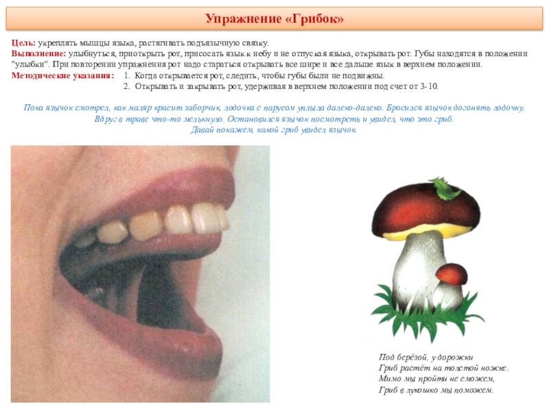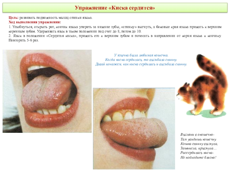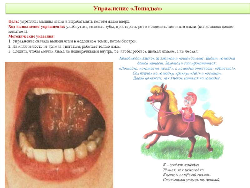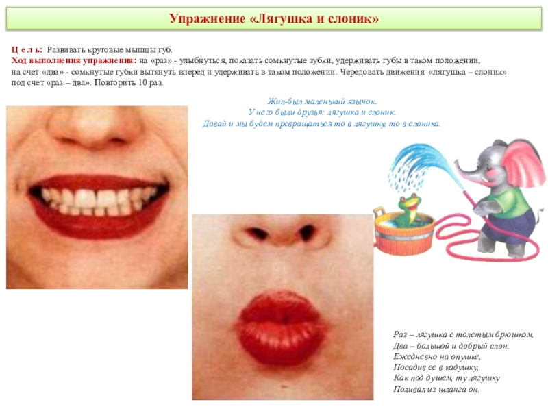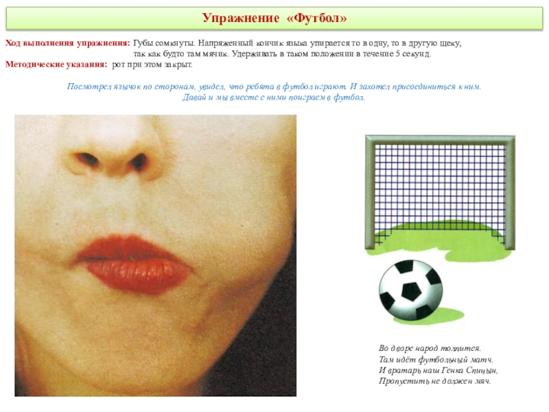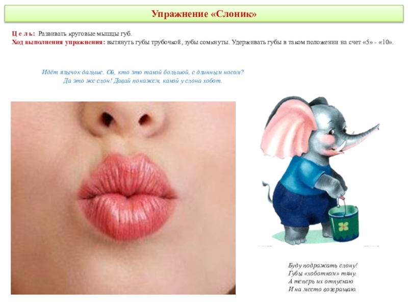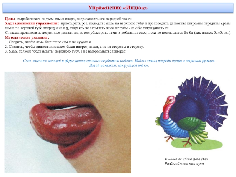 делая круговые движения как бы вокруг губ, но с внутренней стороны рта. Движения выполняются сначала в одном направлении (по часовой стрелке) - 5—6 кругов, затем в другом направлении (против часовой стрелки) 5—6 кругов. Скорость движения языка можно менять. Удерживать в таком положении в течение 5 секунд.Методические указания: рот при этом закрыт.