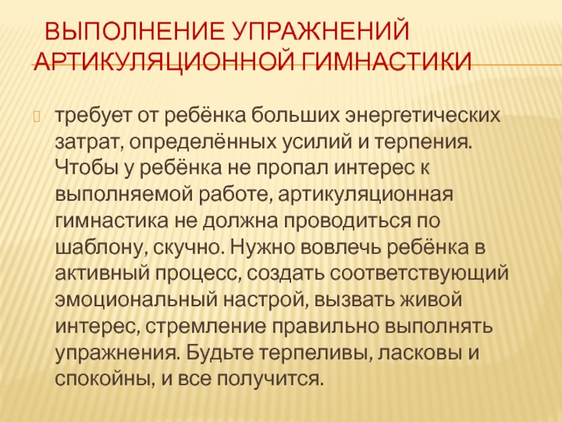 выполнение упражнений артикуляционной гимнастикитребует от ребёнка больших энергетических затрат, определённых усилий и терпения. Чтобы у ребёнка