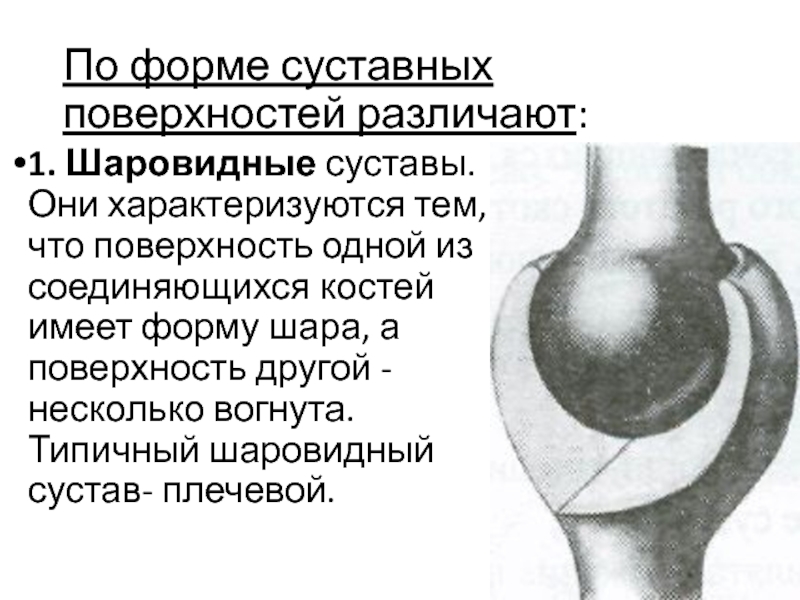 поверхность другой - несколько вогнута. Типичный шаровидный сустав- плечевой.
