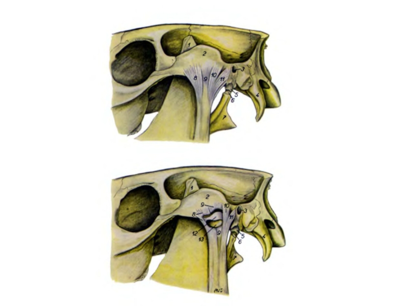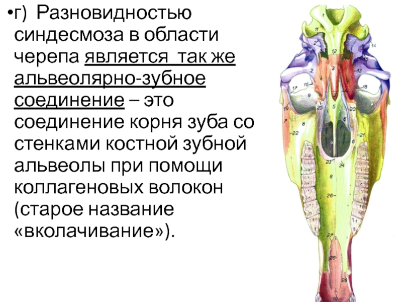 Слайд 12г) Разновидностью синдесмоза в области черепа является так же альвеолярно-зубное