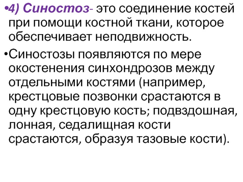 костями (например, крестцовые позвонки срастаются в одну крестцовую кость; подвздошная, лонная, седалищная кости срастаются, образуя тазовые кости).
