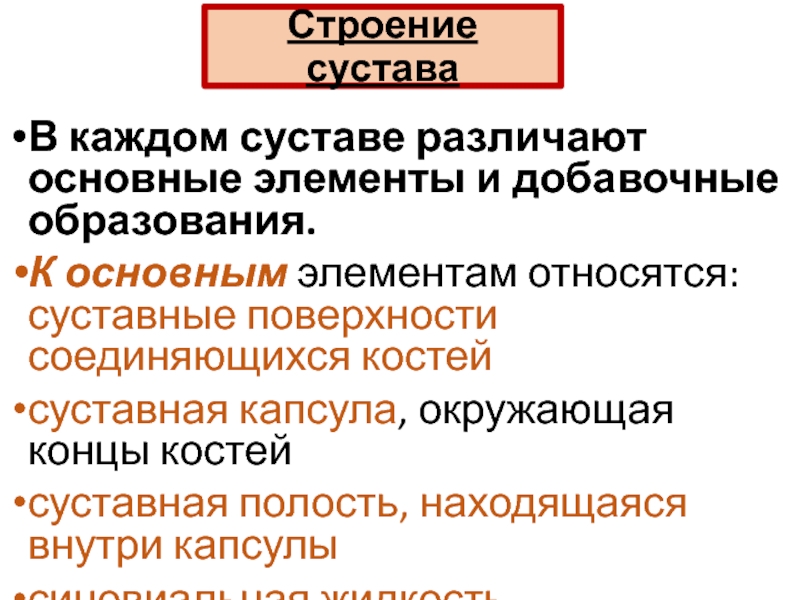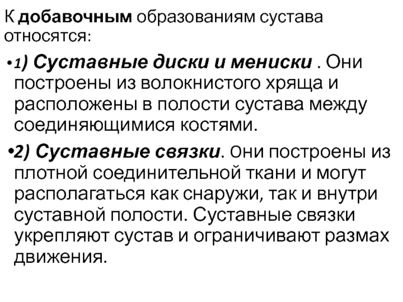 основным элементам относятся: суставные поверхности соединяющихся костей