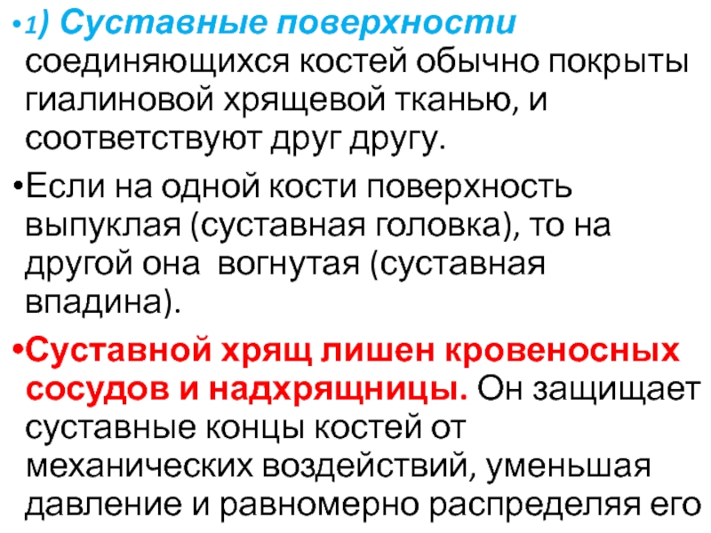 Слайд 251) Суставные поверхности соединяющихся костей обычно покрыты гиалиновой хрящевой тканью,