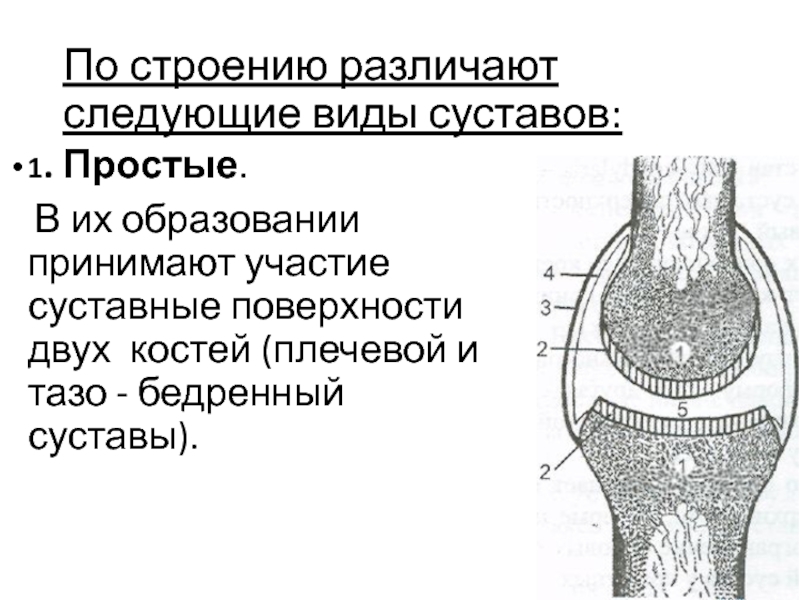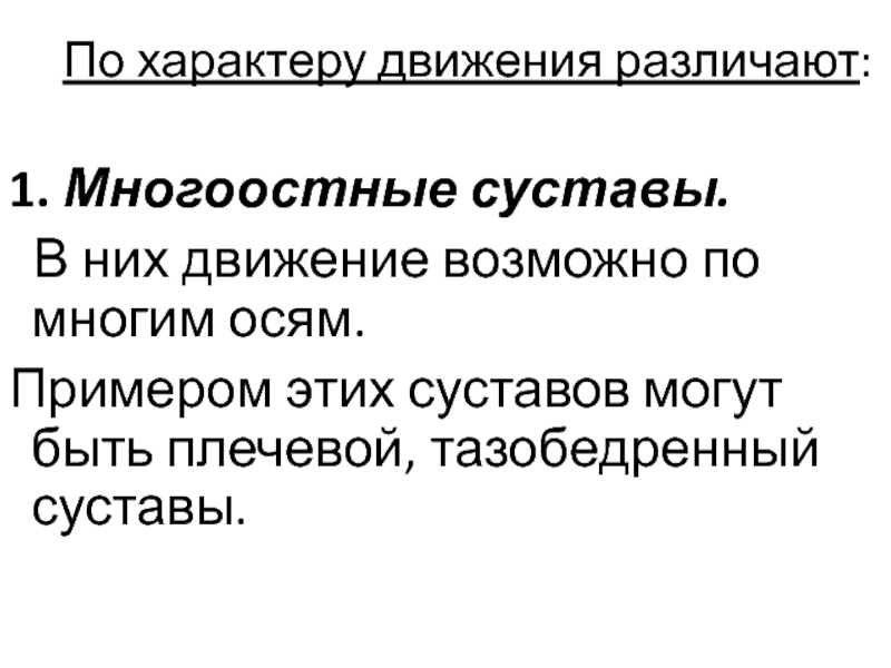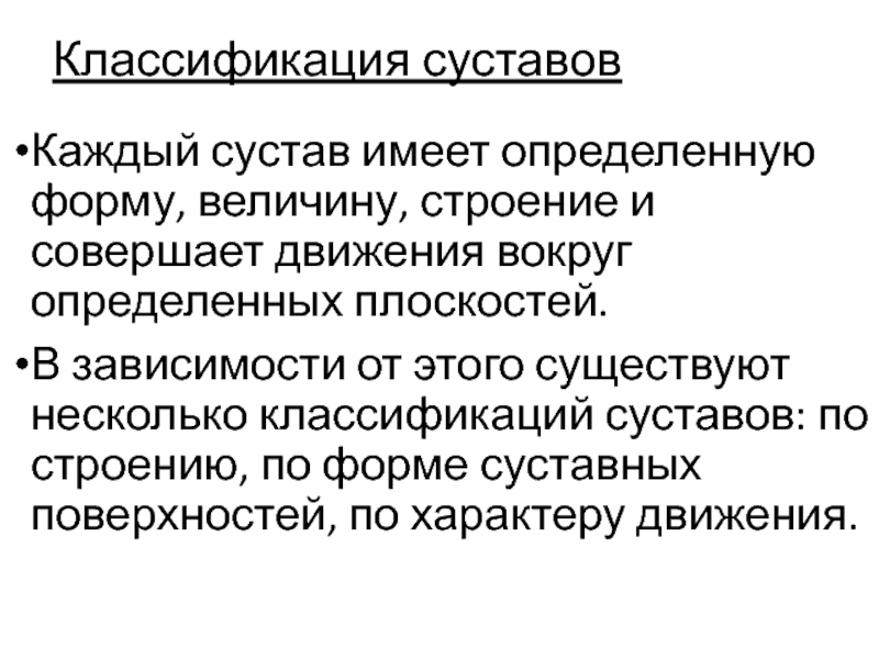 суставов: по строению, по форме суставных поверхностей, по характеру движения.