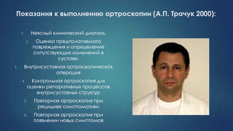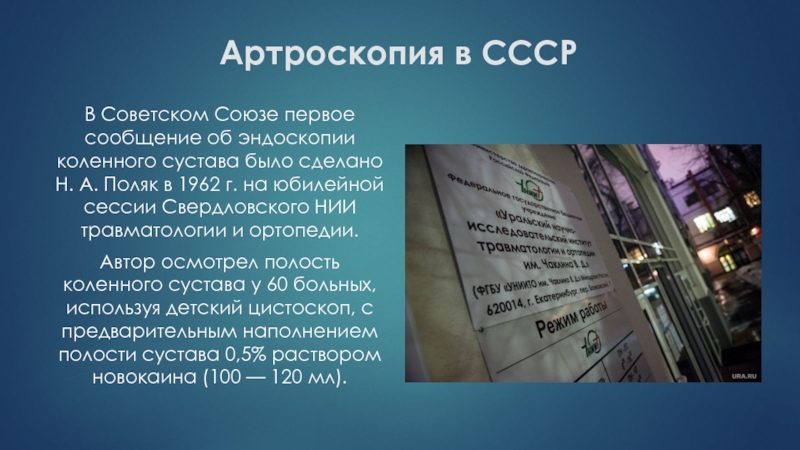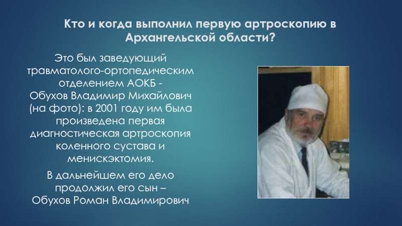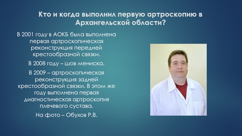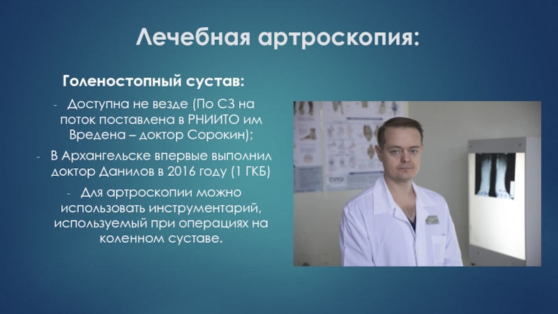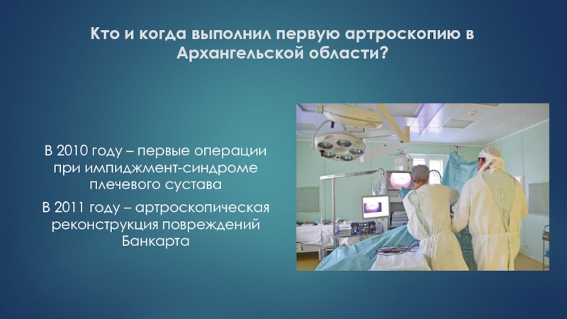 Слайд 60Кто и когда выполнил первую артроскопию в Архангельской области?