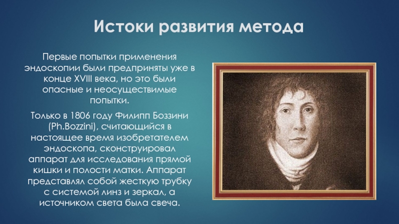 Только в 1806 году Филипп Боззини (Ph.Bozzini), считающийся в настоящее время изобретателем эндоскопа, сконструировал аппарат для исследования прямой кишки и полости матки. Аппарат представлял собой жесткую трубку с системой линз и зеркал, а источником света была свеча.