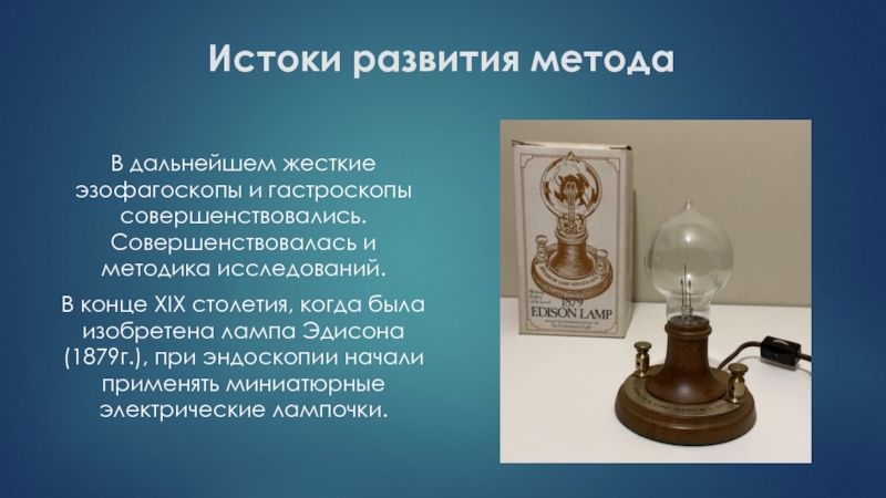Эдисона (1879г.), при эндоскопии начали применять миниатюрные электрические лампочки.
