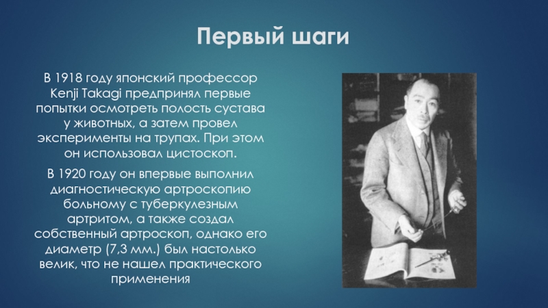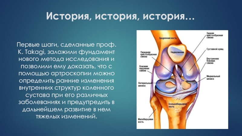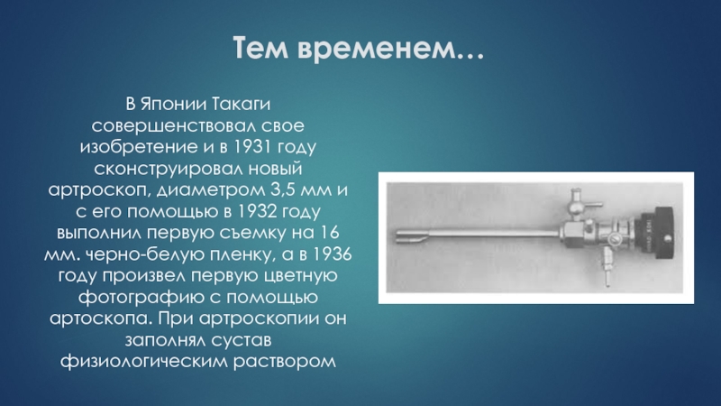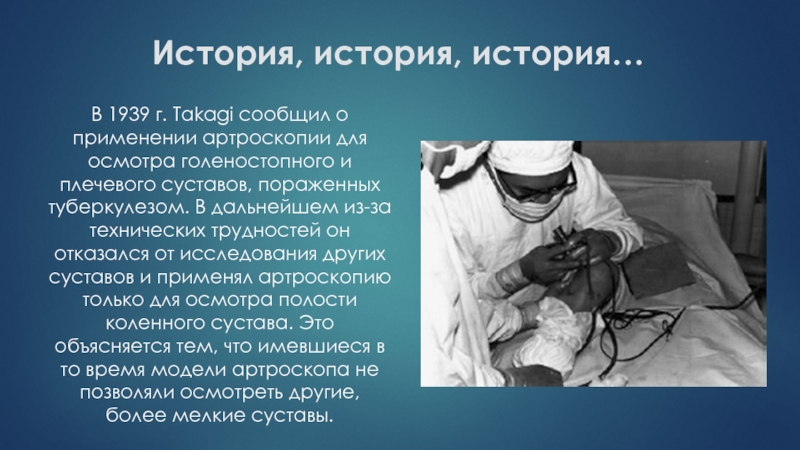 В 1939 г. Takagi сообщил о применении артроскопии