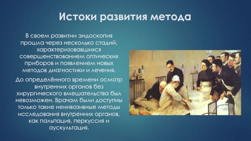 До определённого времени осмотр внутренних органов без хирургического вмешательства был невозможен. Врачам были доступны только такие неинвазивные методы исследования внутренних органов, как пальпация, перкуссия и аускультация.