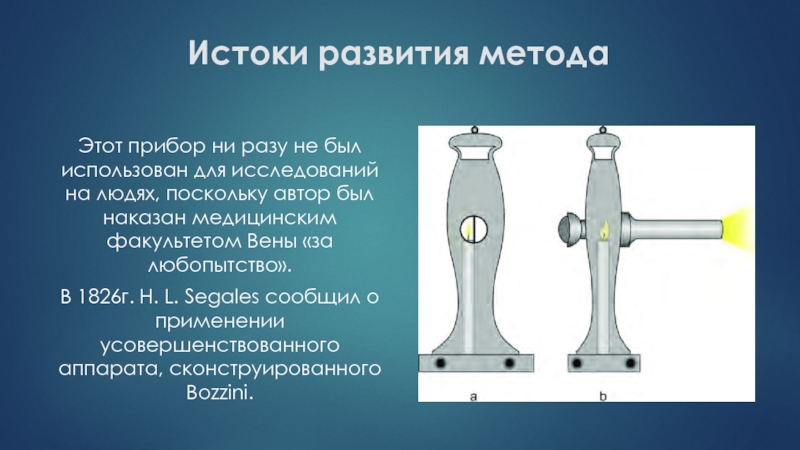В 1826г. H. L. Segales сообщил о применении усовершенствованного аппарата, сконструированного Bozzini.