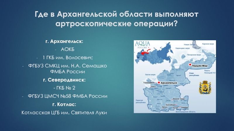 Слайд 62Где в Архангельской области выполняют артроскопические операции?
