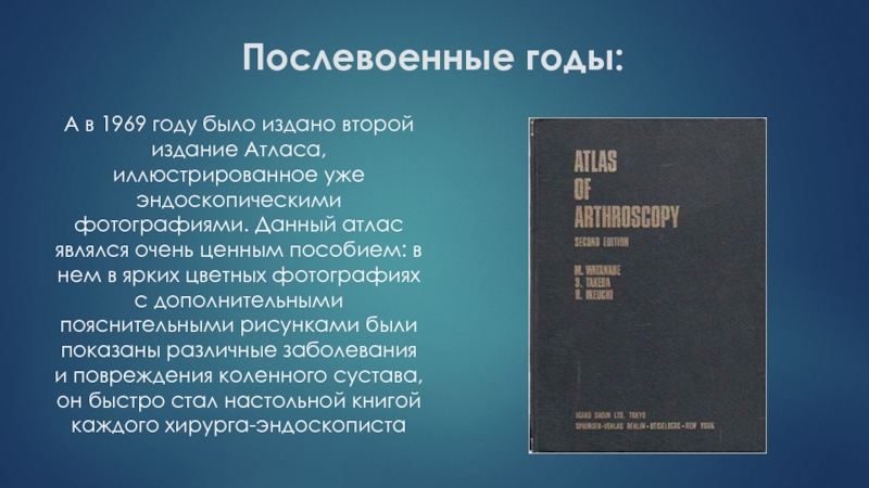 в 1957 году опубликовал первый Атлас артроскопии с цветными рисунками, а в 1959 году создал принципально новый артроскоп с лампочкой на конце, который и послужил прообразом современных моделей