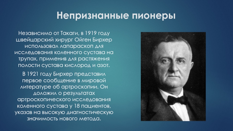 В 1921 году Бирхер представил первое сообщение в мировой литературе об артроскопии. Он доложил о результатах артроскопического исследования коленного сустава у 18 пациентов, указав на высокую диагностическую значимость нового метода.