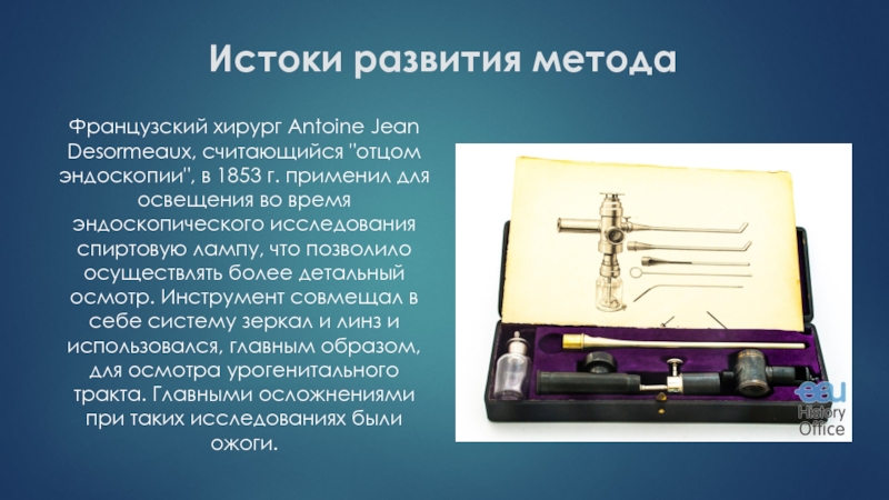 спиртовую лампу, что позволило осуществлять более детальный осмотр. Инструмент совмещал в себе систему зеркал и линз и использовался, главным образом, для осмотра урогенитального тракта. Главными осложнениями при таких исследованиях были ожоги.