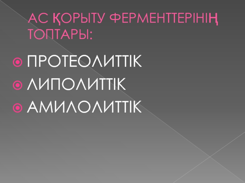 Слайд 4АС ҚОРЫТУ ФЕРМЕНТТЕРІНІҢ ТОПТАРЫ: