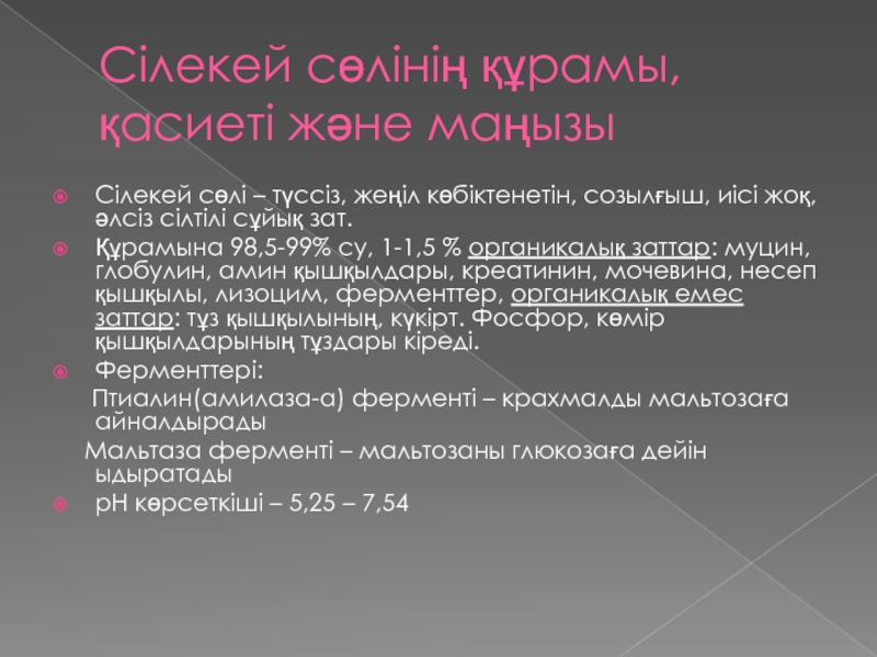 Слайд 11Сілекей сөлінің құрамы, қасиеті және маңызы