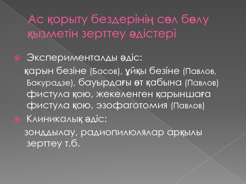 Слайд 5Ас қорыту бездерінің сөл бөлу қызметін зерттеу әдістері