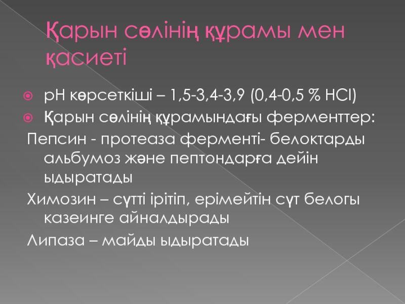 Слайд 13Қарын сөлінің құрамы мен қасиеті