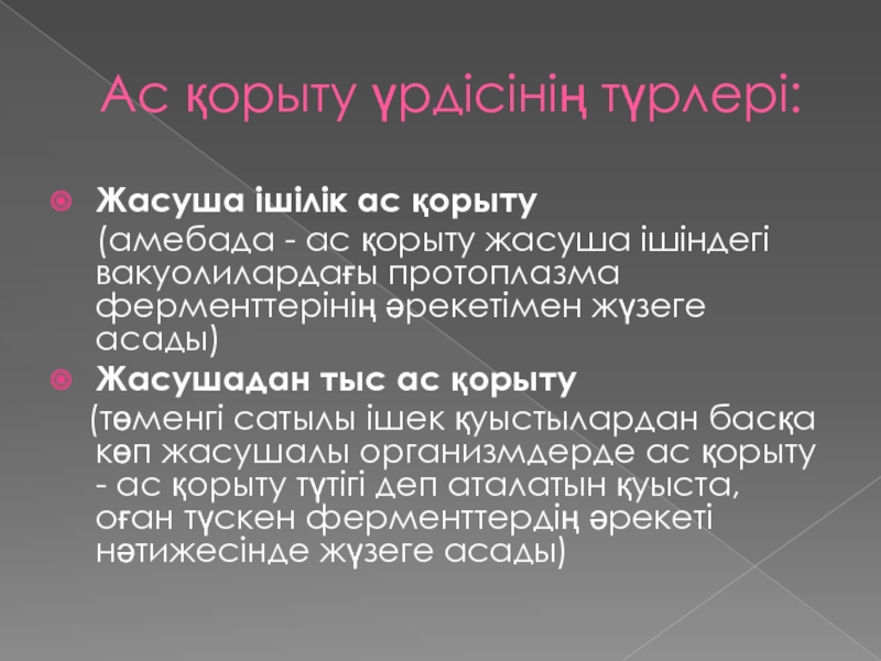 - ас қорыту жасуша ішіндегі вакуолилардағы протоплазма ферменттерінің әрекетімен жүзеге