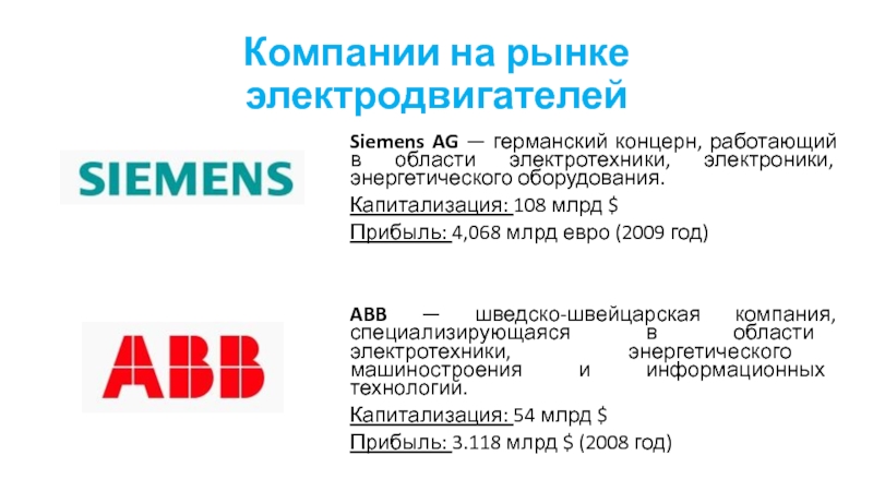 Компании на рынке электродвигателейSiemens AG — германский концерн, работающий в области электротехники, электроники, энергетического оборудования.Капитализация: 108 млрд