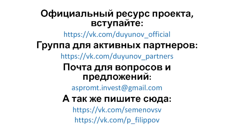 Официальный ресурс проекта, вступайте:https://vk.com/duyunov_officialГруппа для активных партнеров:https://vk.com/duyunov_partnersПочта для вопросов и предложений: aspromt.invest@gmail.comА так же пишите сюда:https://vk.com/semenovsvhttps://vk.com/p_filippov
