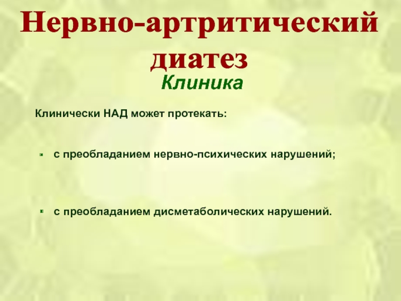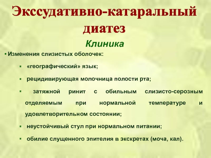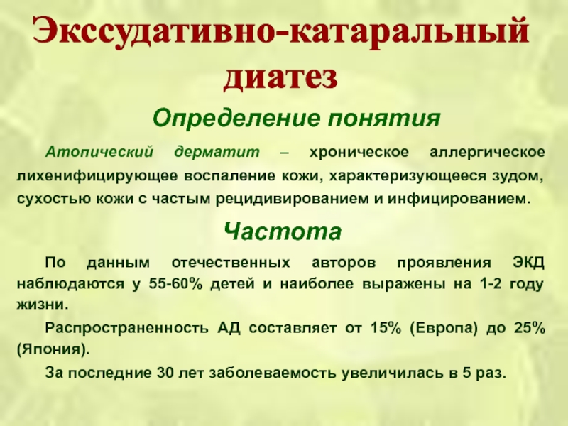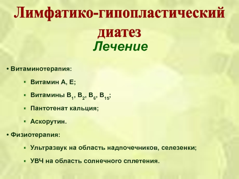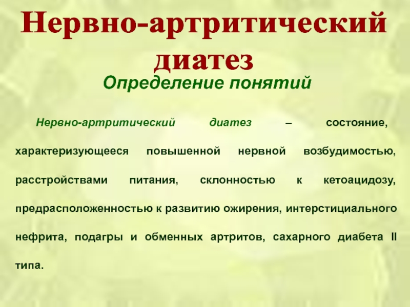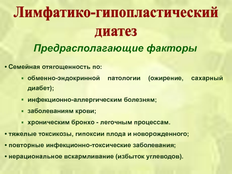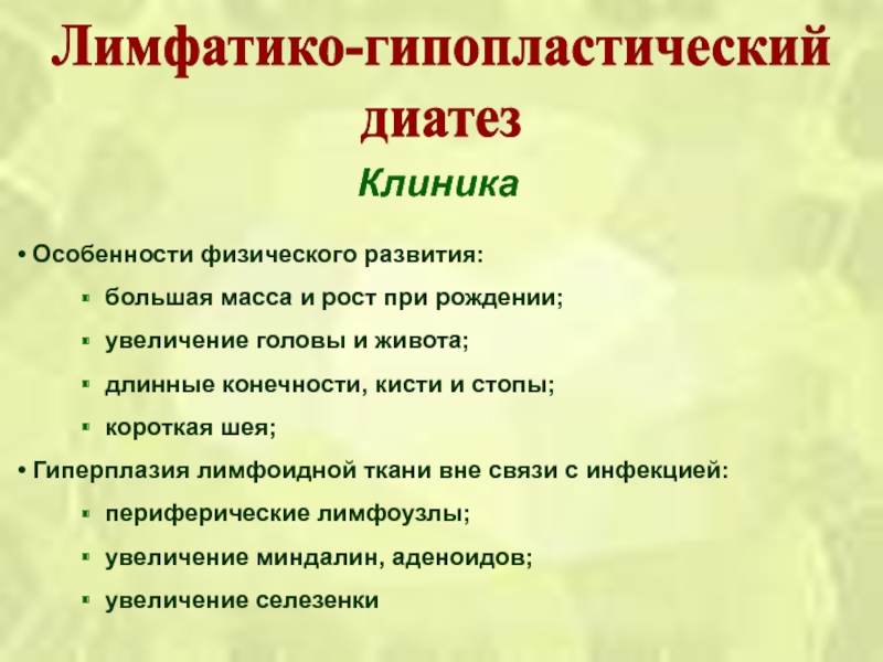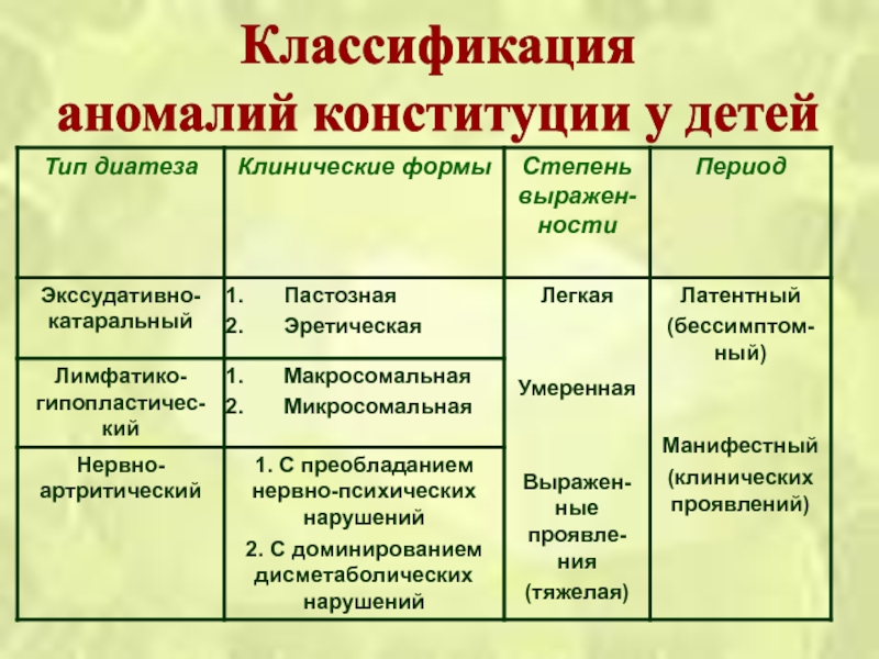 Аномалии конституции (диатез) – временное нарушение, характеризующееся неадекватной реакцией на обычные внешние и внутренние воздействия и предрасполагающее к развитию определенных патологических процессов, тяжелому течению болезней.