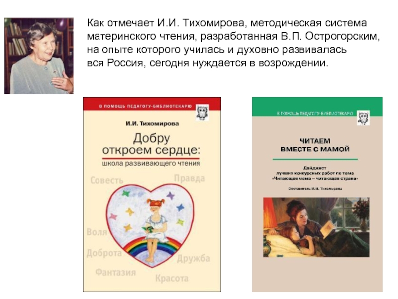 Слайд 73Как отмечает И.И. Тихомирова, методическая система материнского чтения, разработанная В.П.