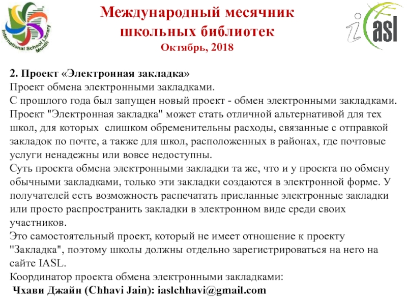 Международному месячнику школьных библиотек – одному из самых любимых проектов Международной ассоциации школьных библиотекарей (IASL). Идея проекта заключается в том, что люди, отвечающие за школьные библиотеки во всем мире, могут выбрать в октябре один день, неделю или даже весь месяц и посвятить их пропаганде роли школьных библиотек и проведению праздничных мероприятий.